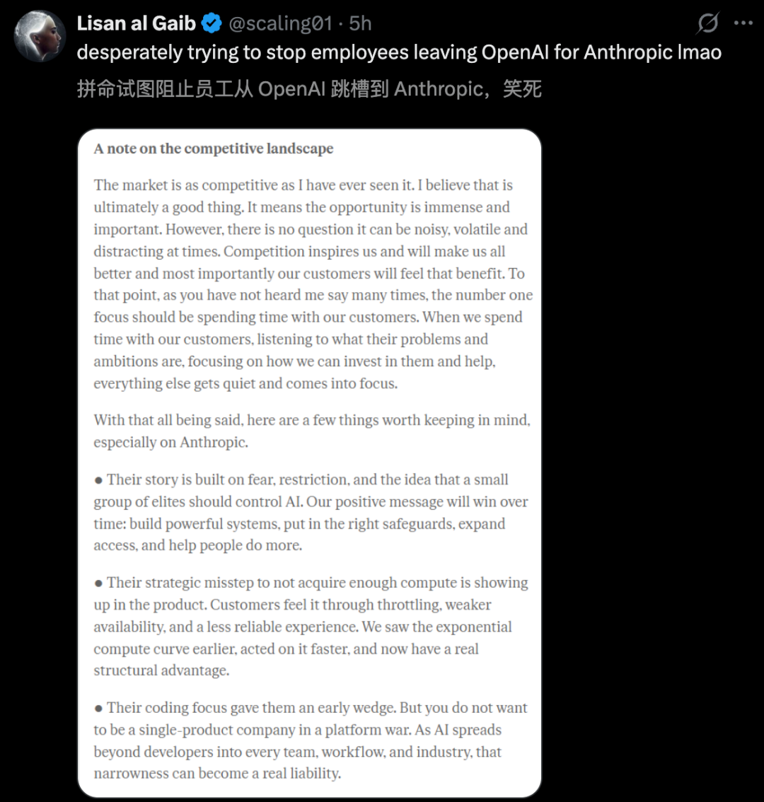 先说整份备忘录中,最具戏剧性的部分——便是对头号劲敌Anthropic的公开处刑。