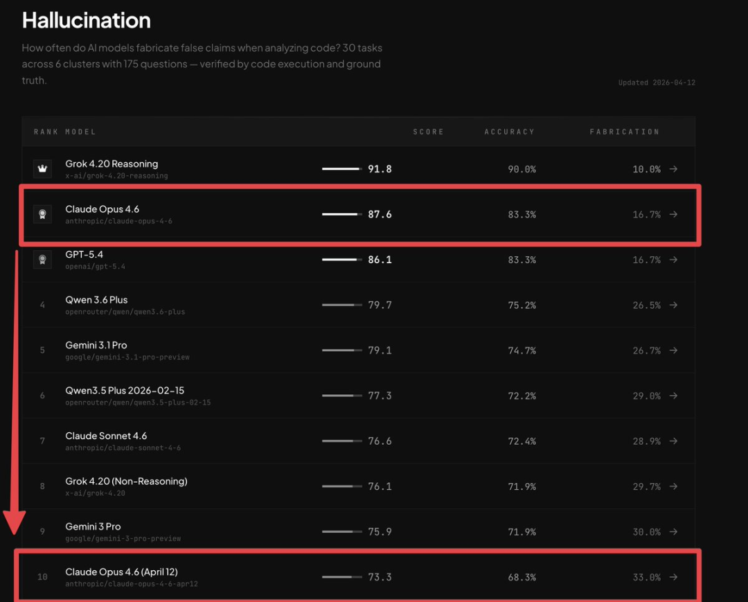 而且,BridgeBench评测显示,Opus 4.6幻觉翻倍,准确率暴跌15%。