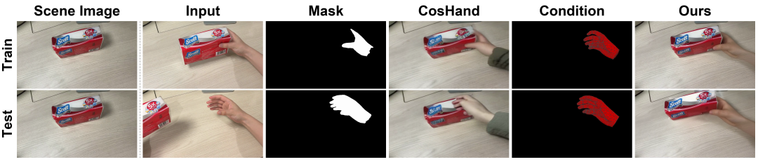 这就是所有基于 2D 手部 mask 方法的致命伤——训练时看到的是残缺的手,推理时却收到完整的手,分布直接错配。下图清楚地展示了这一点:上排训练场景中 mask 被物体截断,下排凭空手势中 mask 完整,现有方法(如 CosHand)因此产生严重伪影。