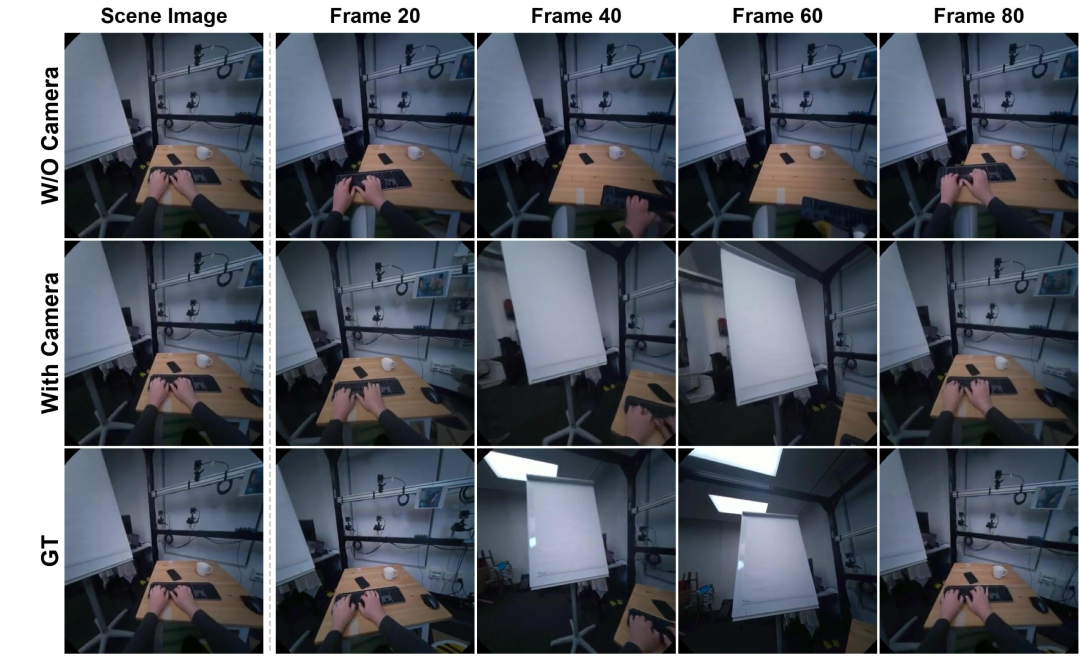 移除相机建模模块后,FVD从218直接飙到815——背景开始跟着手一起漂移。