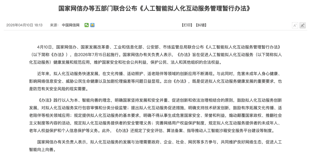 4月10日,国家互联网信息办公室、国家发展和改革委员会、工业和信息化部、公安部、国家市场监督管理总局联合公布《人工智能拟人化互动服务管理暂行办法》(以下简称《办法》),自2026年7月15日起施行。这是我国首部针对人工智能拟人化互动服务领域的专项管理法规,标志着AI伦理与安全治理框架进一步完善。