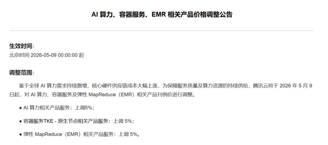 2026年4月9日,腾讯云发布公告称,受全球AI算力需求激增及核心硬件供应链成本上涨影响,自2026年5月9日起,对旗下AI算力、容器服务TKE-原生节点及弹性MapReduce(EMR)相关产品刊例价统一上调5%。这是腾讯云一个月内的第二次AI服务涉价调整——3月11日,腾讯云已率先上调混元大模型API价格,部分服务涨幅超过4倍。此次将涨价延伸至更底层的算力租赁产品,标志着其定价策略调整已从模型API层覆盖至整个算力基础设施层。