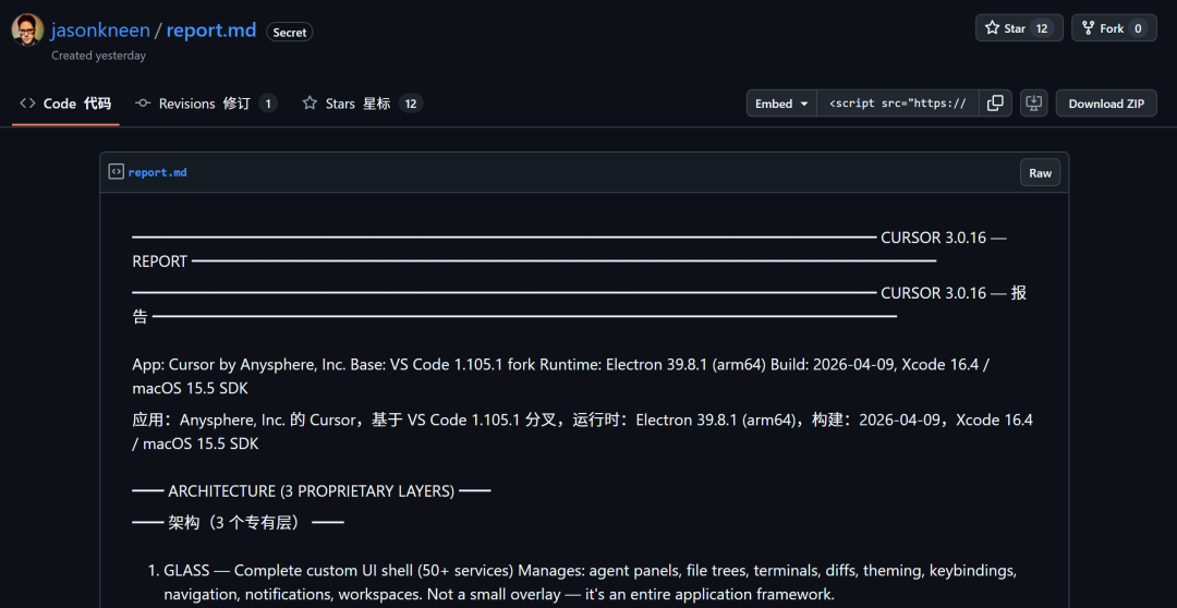 事情是这样的,知名开发者Jason Kneen在深度逆向分析Cursor 3.0后,在GitHub上发布了一份炸裂的技术报告。