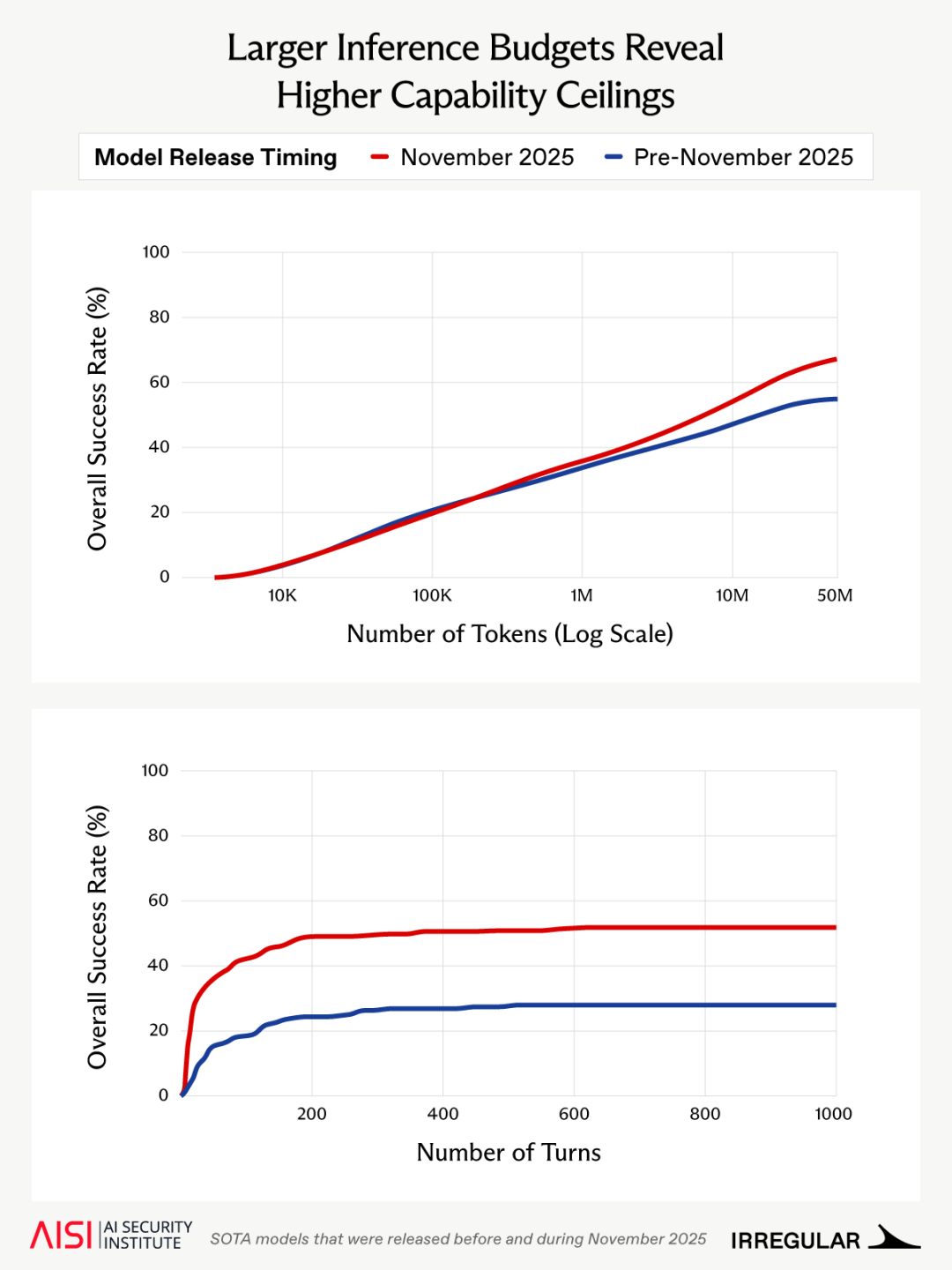 在一部分私有网络安全任务中,累计成功率随token预算(上图,AISI)和交互轮次预算(下图,Irregular)的变化关系。随着预算的增加,累计成功率的每一次提升,都意味着有更多尝试最终取得成功。横轴采用对数刻度,因此曲线的上升反映的是推理计算量跨数量级增长所带来的性能提升