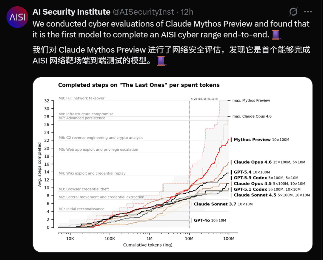 AISI惊呼:Claude Mythos是全球首个完成AISI网络靶场端到端测试的模型!