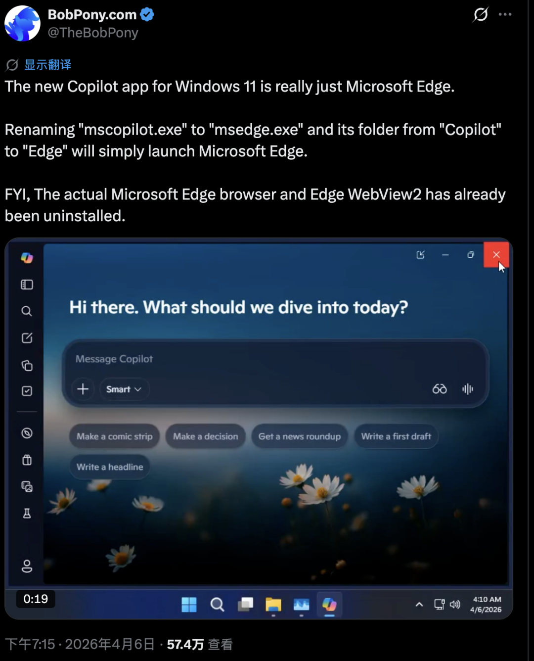 微软更是被抓包,所谓新出的Copilot App,其实就是Edge套壳,浏览器三个字都快不好意思写在脸上了。