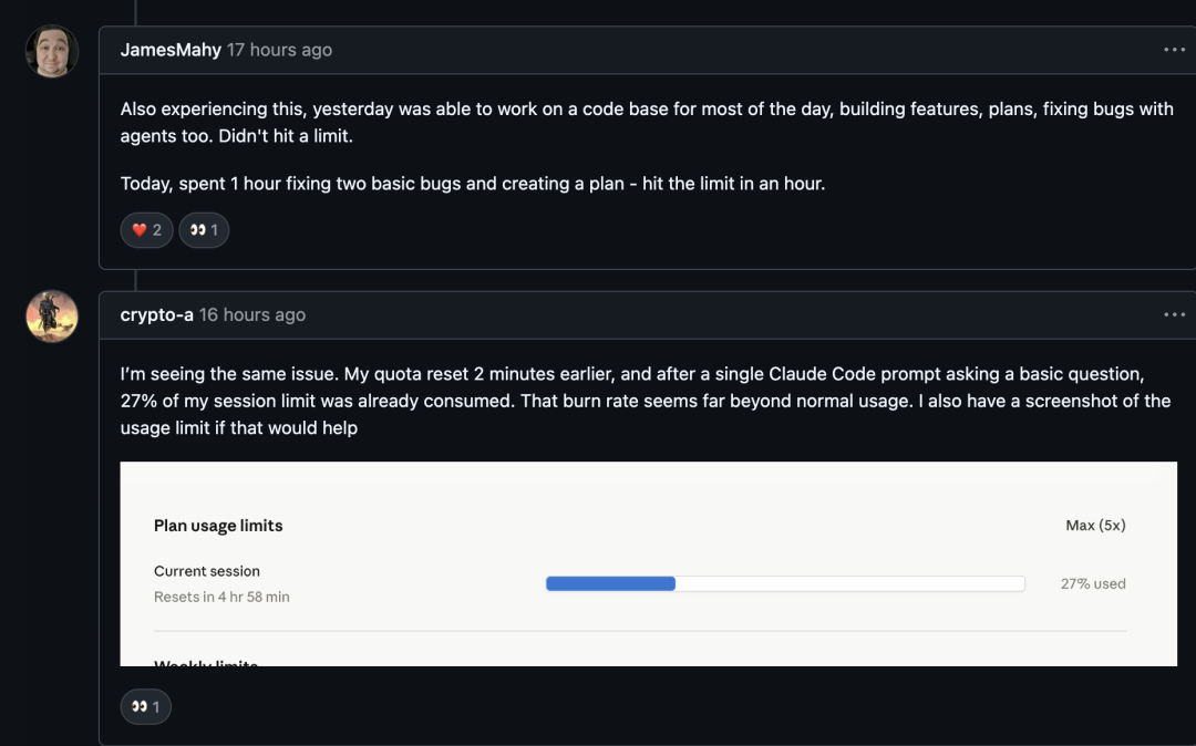 Hacker News上有人说,3月底后Claude性能「肉眼可见下滑」,长会话动不动就卡,token额度下降像开了闸的水。