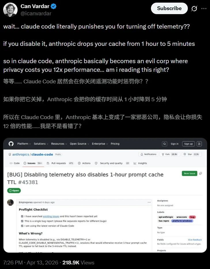 开发者们发现,只要在环境变量里加一句DISABLE_TELEMETRY=1,Claude Code的prompt cache TTL就从1小时瞬间回退到5分钟。