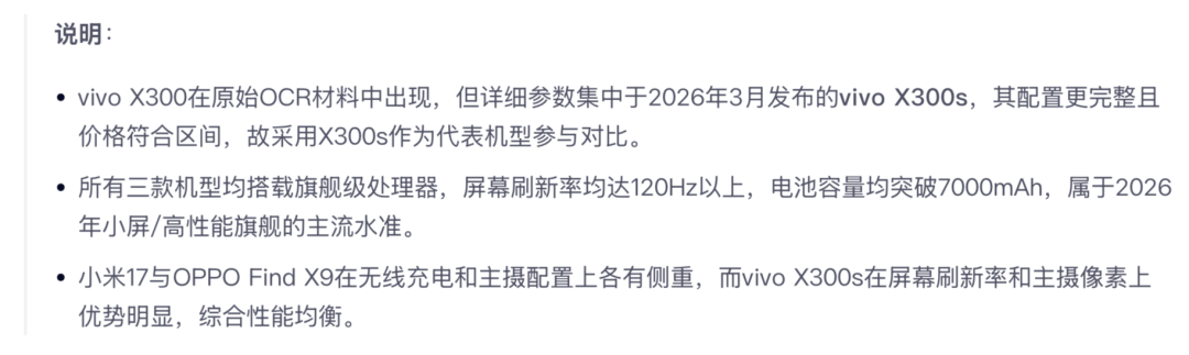 直接整出了vivo X300s、小米17和OPPO Find X9三款手机的对比,处理器、屏幕、电池、摄像头这些核心参数全都安排上了。