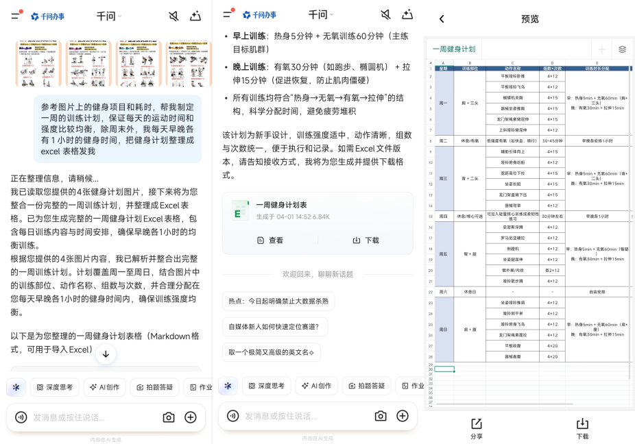 不管是随手拍的健身计划、打印出来的课程表、皱巴巴的报销单,还是密密麻麻的体检报告、一堆名片小票,只要拍张照丢给千问,它都能精准识别、理解内容,再自动帮你整理成规范好用的Excel表格。