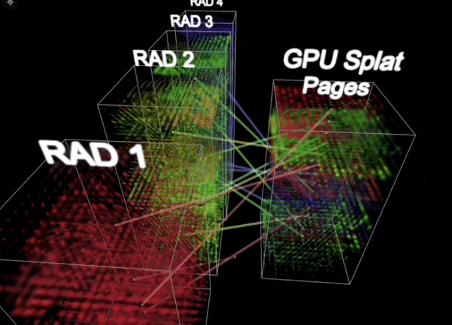 它会在GPU中预先分配一个固定大小的内存池(容量为1600万个splats),并构建一套页表映射机制,将GPU中的 64K splats“内存页”,与RAD文件中的64K泼溅点数据块一一对应。