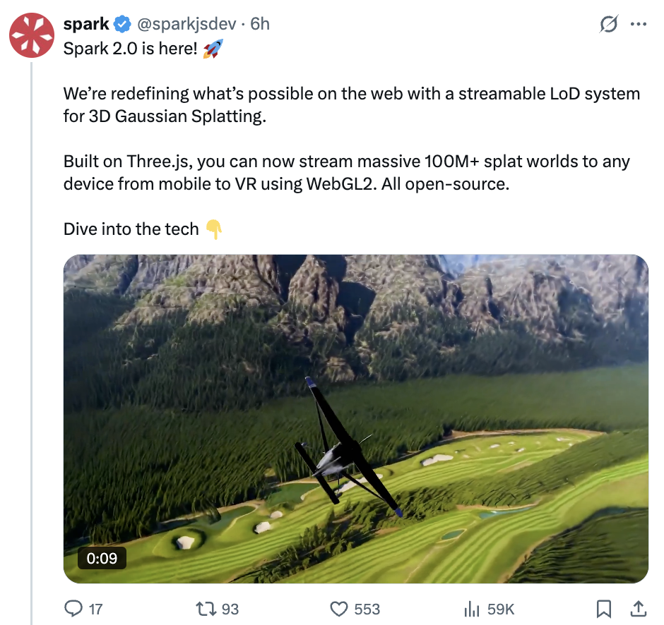 开源3D高斯溅射渲染引擎Spark 2.0。