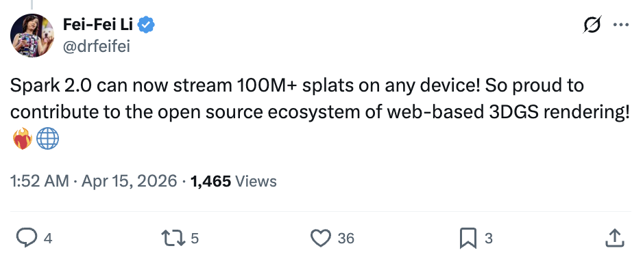Spark 2.0现已可在任意设备上流式渲染超1亿splats!能为基于网页的3D高斯溅射渲染开源生态贡献力量,我深感自豪!