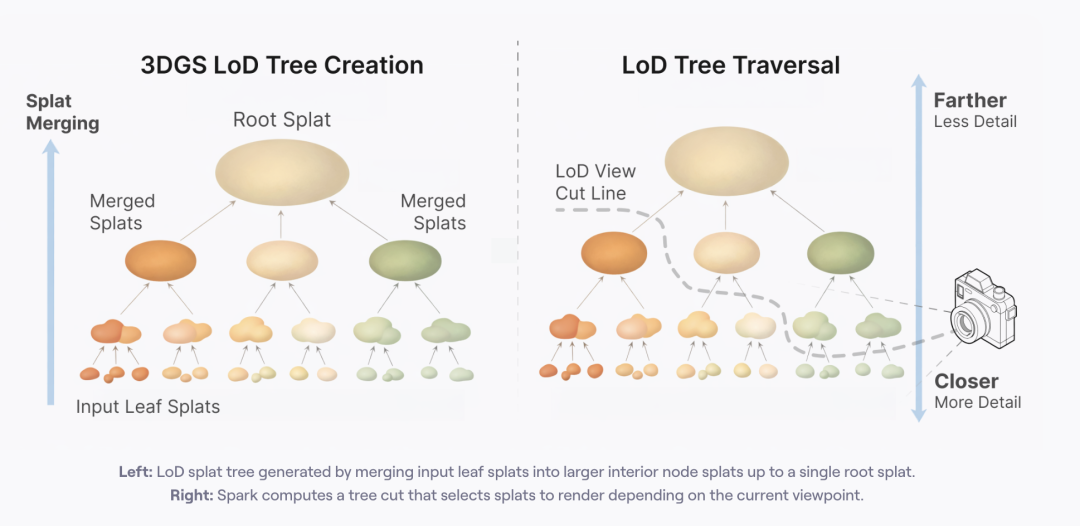 Spark采用的是连续型Level-of-Detail,核心是为所有splats构建一个层级化结构——Level-of-Detail Gaussian splat tree。