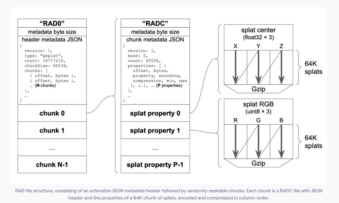 Spark 2.0定义了一种全新的文件格式——.RAD(全称Radiance Fields,辐射场)。该格式不仅能有效压缩3D高斯溅射数据,还支持随机访问流式加载,实现了场景的渐进式精细化渲染,完美适配网络传输场景。