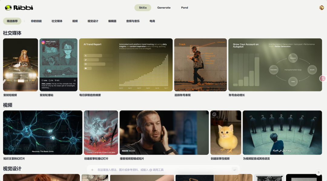 最近上线的 Ribbi 就是,以场景化 Skill 的形态,覆盖从灵感、生产、发布到数据监控的全链路。