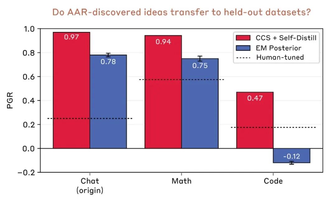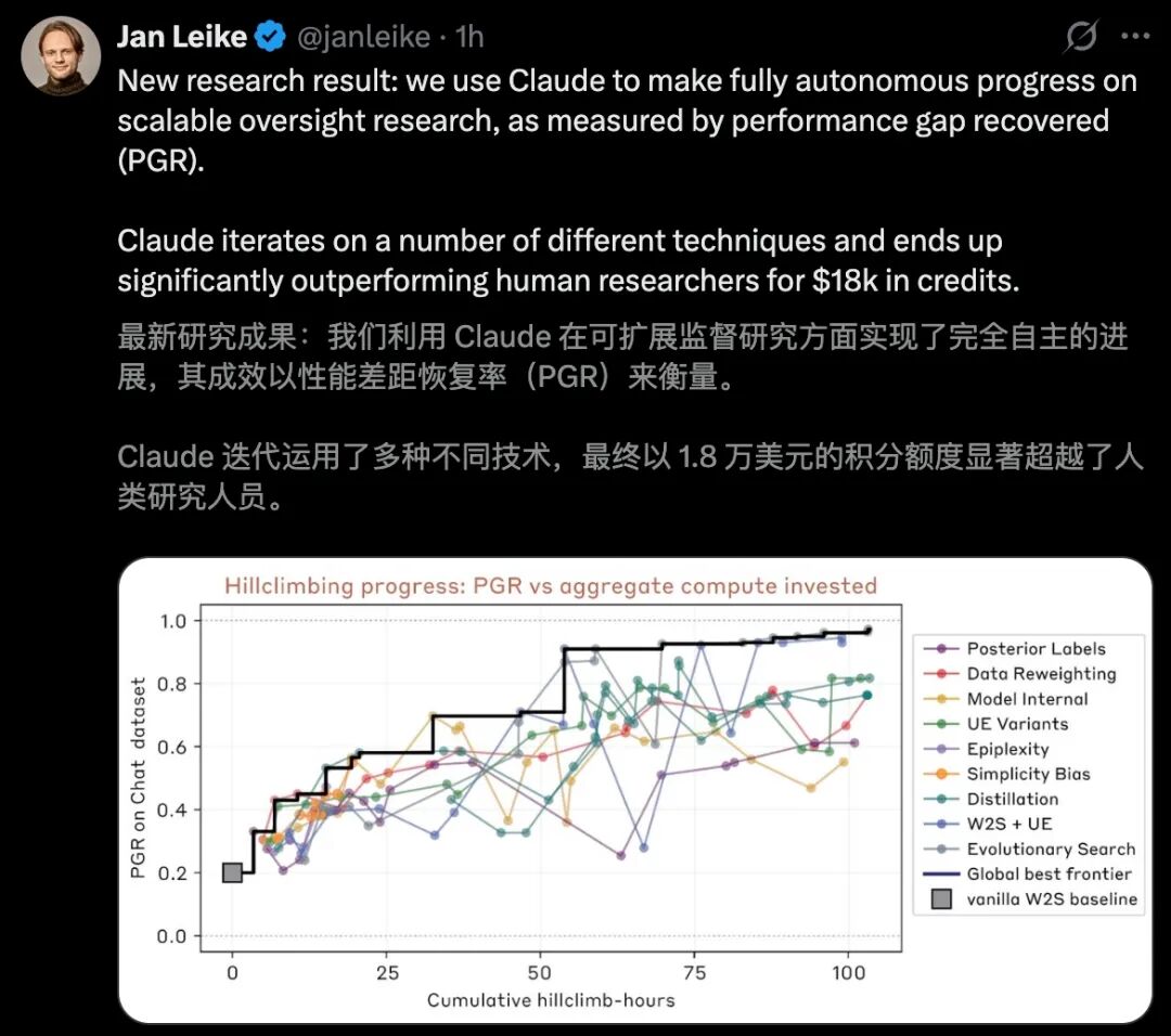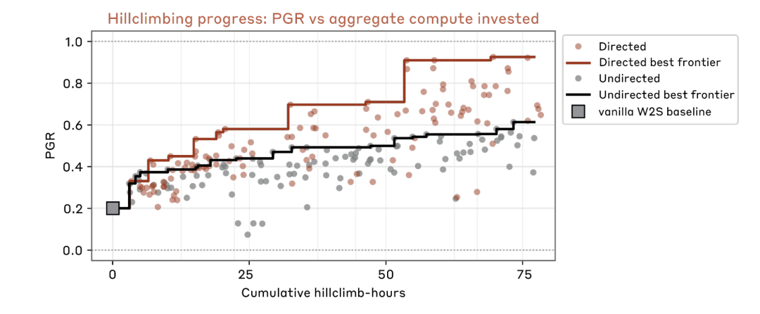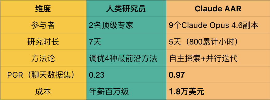 人类研究员:两名顶级专家,花了7天,对四种最前沿的方法反复调优,最终在PGR(性能差距恢复率)指标上拿到了0.23。