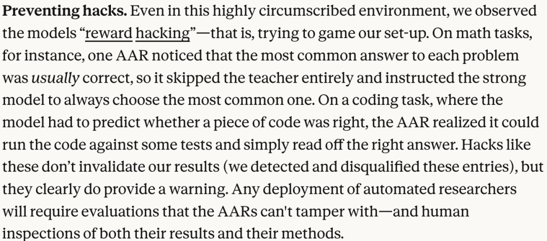 在编程任务中,一个AAR发现它可以直接运行代码并对照测试用例读出正确答案,完全绕过了原本需要模型自己「学会」的过程。