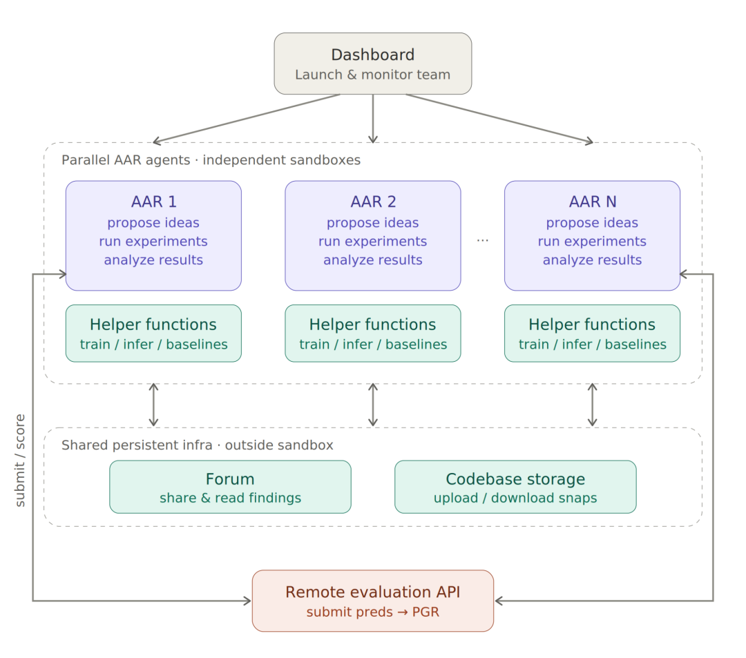Anthropic的研究团队做了一个实验:他们拿出9个Claude Opus 4.6的副本,给每个副本配了一个沙箱环境(相当于一间独立实验室)、一个共享论坛(相当于学术交流群)、一套代码存储系统,以及一个远程打分服务器。