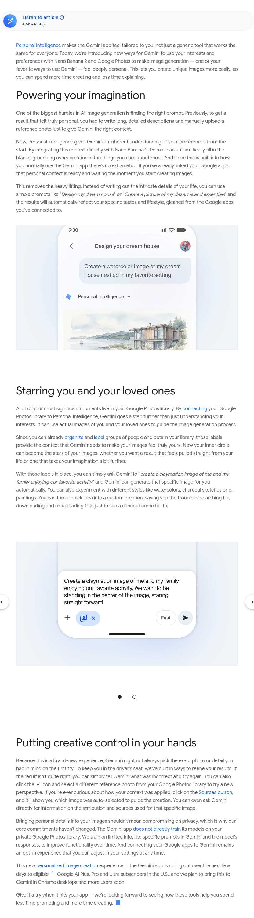 谷歌推出Personal Intelligence功能,让Gemini应用更个性化。通过整合用户兴趣、偏好及Nano Banana 2模型与Google Photos,Gemini在图像生成中能自动理解并融入个人风格,无需冗长提示词或手动上传参考图。该技术显著降低创作门槛,提升生成效率与贴合度,使用户更专注于创意本身而非反复调试提示。图像生成因此更具个性、直观且高效,真正实现“为你而生”的AI体验。(200字)