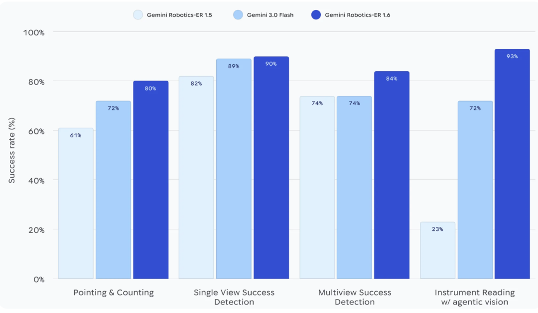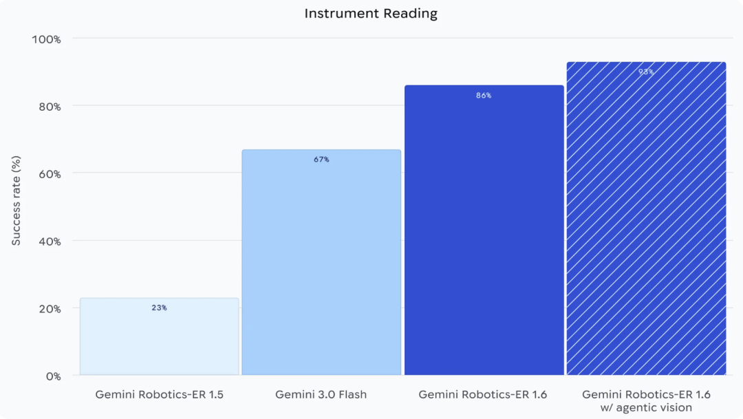 这套组合的效果,ER 1.5的仪表识别成功率是23%,加上Agentic Vision之后,ER 1.6达到了93%。