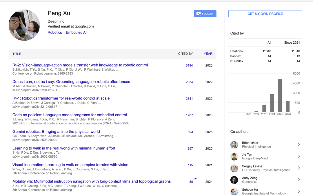 Peng Xu是DeepMind机器人基础模型方向的研究员,专注机器人学习与大模型的结合,不仅参与过上面的机器人打乒乓球,也是RT-1、RT-2、Cap(Code as policy)、Gemini robotics等一系列著名工作的作者之一。