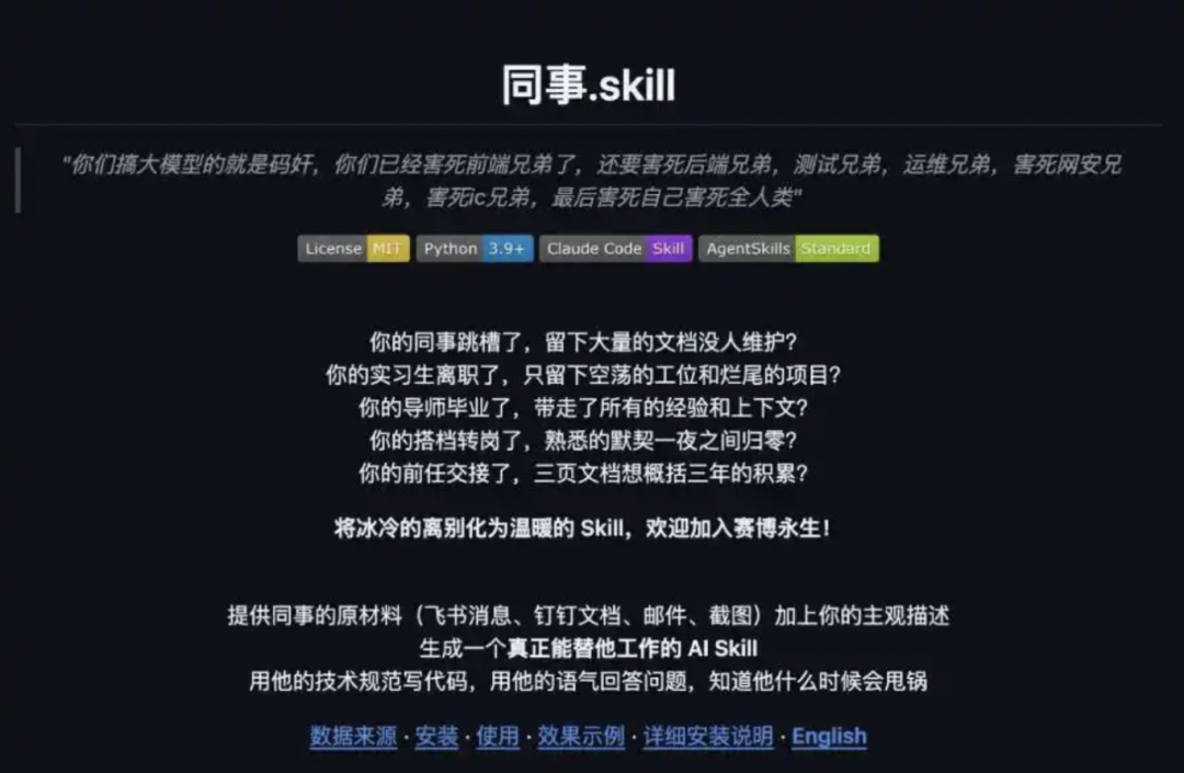近来,技术社区GitHub上爆火的“同事.skill”引起了广泛讨论,这项skill的技能点是“提供同事的材料加上你的主观描述,生成一个真正能替他工作的AI skill”,并宣称“将冰冷的告别化为温暖的skill,加入赛博永生”。