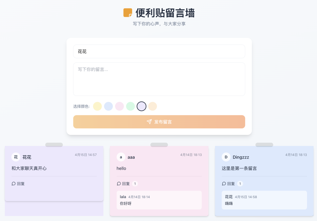 请生成一个便利贴样式留言墙,支持填写名字发布留言、永久保存、所有人可查看、可对留言回复互动,最终输出可公开访问的链接。