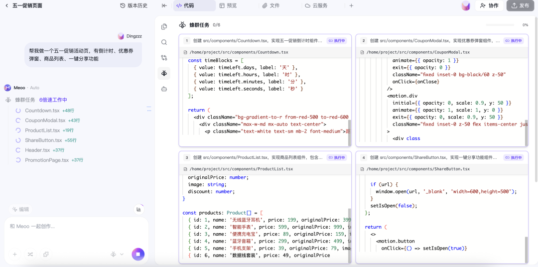 好家伙,一群勤劳的小蜜蜂直接6倍速起飞,把开发流程切成倒计时、优惠券、产品列表等六块组件,同时开工,主打一个并行多发。