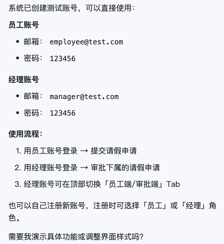 帮我做一个请假审批系统,员工可以提交请假申请,领导可以审批通过或驳回,有审批记录