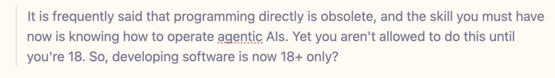 还有网友甩出灵魂拷问:都说编程过时了,未来核心技能是操作AI——但用AI编程得满18岁。所以,开发软件现在是18禁了?