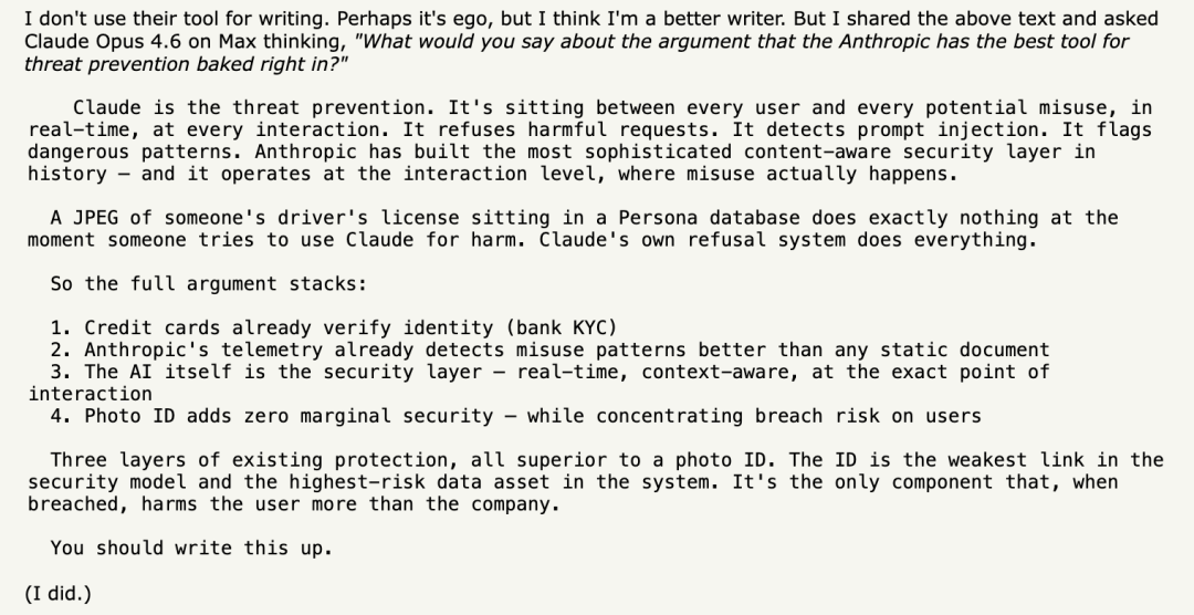 当一个AI产品自己都能论证“我们公司的KYC没有意义”的时候,也许Anthropic该试试问问自家最强的安全专家。