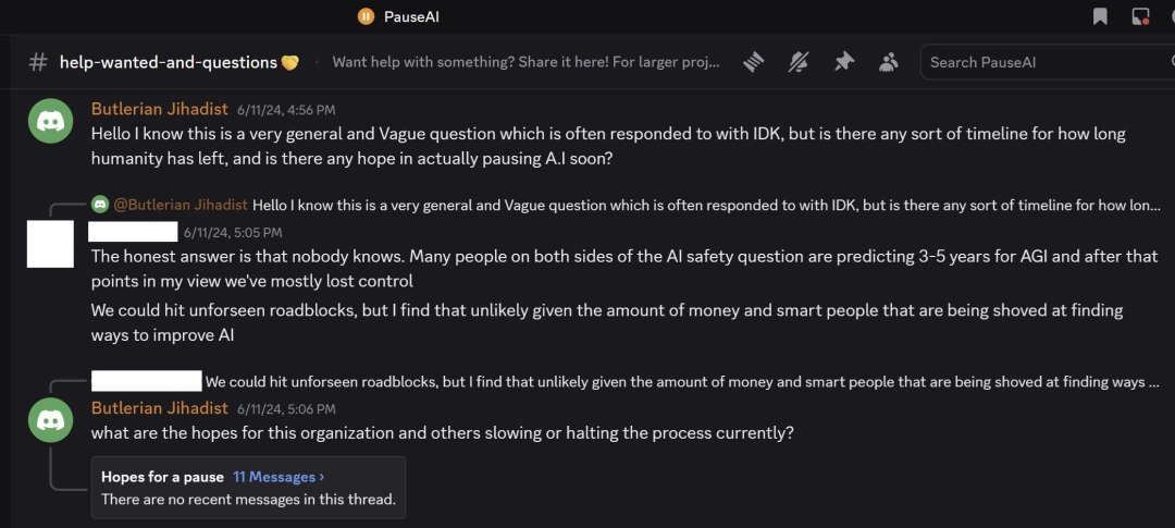 2、你好,我知道这是一个非常笼统和模糊的问题,通常得到的回答是“不知道”,但我想问:对于人类还剩多少时间,有没有某种时间表?以及,是否有希望真的能很快暂停AI发展?