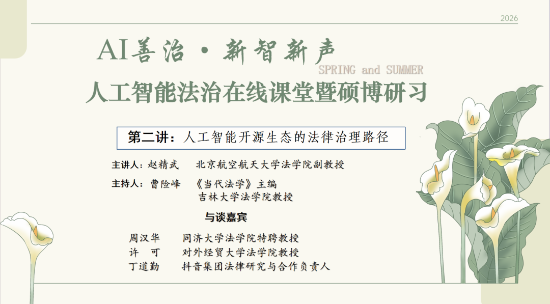 AI刷屏的时代,法治如何跟上技术的脚步?算法决策、智能模型渗透生活的每一处,旧规范如何适配新变革?前沿争议如何破解?4月16日晚19:00,“AI善治・新智新声”人工智能法治在线课堂暨硕博研习(春夏季)第二场讲座即将开讲,带大家共同解锁开源治理前沿密码!本次系列活动由中国政法大学人工智能法研究院牵头,联合西南政法大学科技法学研究院、华东政法大学数字法治研究院等多所顶尖高校科研机构,携手北京科技创新中心研究基地、AI善治学术工作组,并获iCourt支持,集结AI法治领域青年及专家学者,搭起专属硕博的高水平交流平台,让前沿研究不再“高冷”,让思想碰撞触手可及!直播地点:微信搜索"阿里巴巴AI治理中心"或"中国政法大学人工智能法研究院"视频号。从3月至8月,系列研习活动将持续开展,以固定周期、专题推进的形式,既推动人工智能法治十大议题的深入研究与成果产出,也促进学术研究与产业实践的有效衔接,更助力人工智能法治领域的人才培养提质增效,为学科发展注入新动能。期待以该系列活动为契机,进一步凝聚学界、业界力量,围绕人工智能法治领域的前沿问题、难点问题开展常态化研究与交流,推动人工智能法治研究的深化与发展,为人工智能产业的健康有序发展提供坚实的法治理论支撑与智力支持。