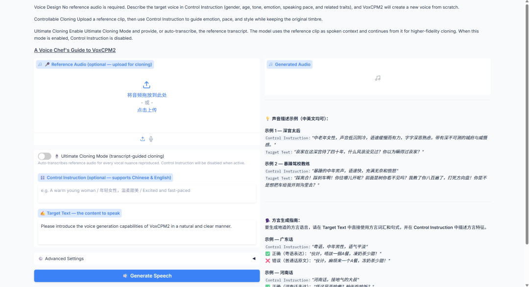 3. VoxCPM2 音色复刻:30+语言、 9 大方言
