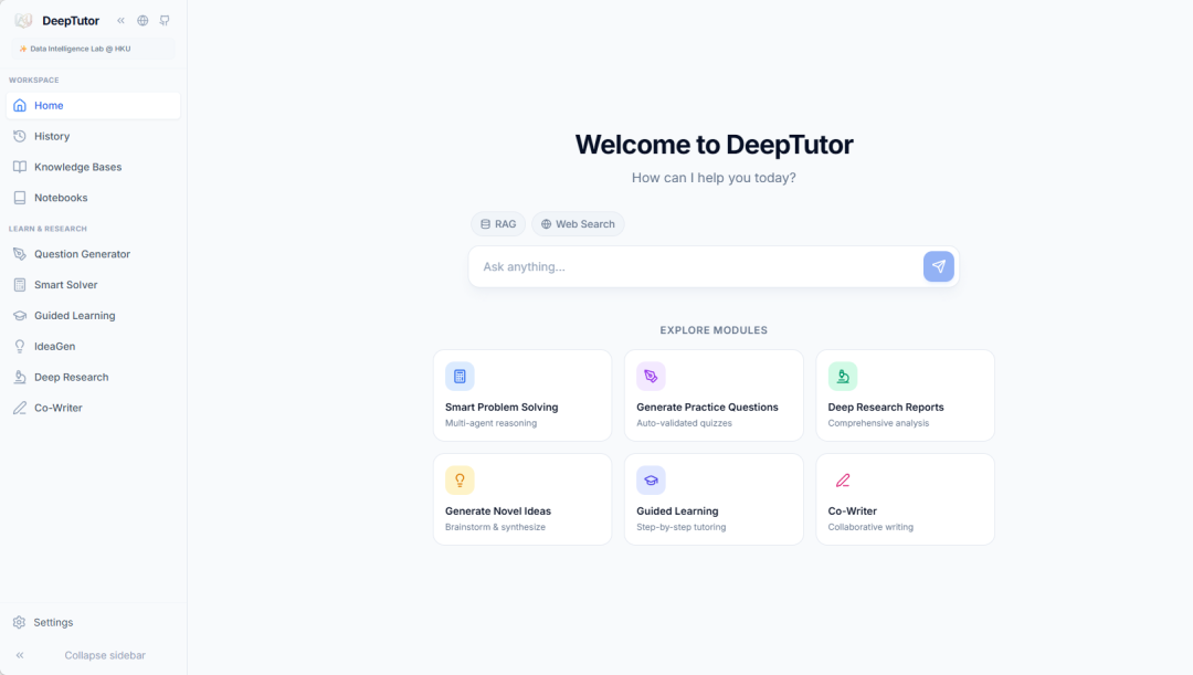 DeepTutor 是由香港大学数据智能实验室于 2026 年 3 月推出的个人学习助手,是一个全方位的 AI 驱动教学系统。该项目整合了四大核心功能模块:海量文档知识问答、交互式学习可视化、知识强化与练习题生成,以及深度研究与创意生成,为学习者提供一站式智能学习体验。