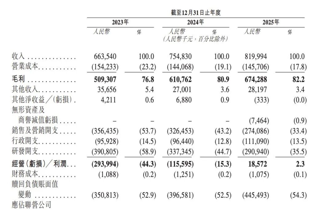 最新的财报相当亮眼:2025年全年营收8.20亿元,经调整净利润转正达5712.7万元,毛利率82.2%。