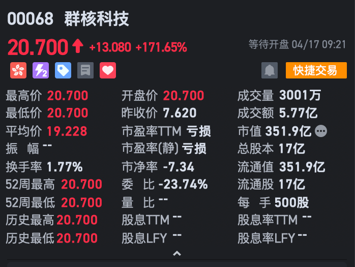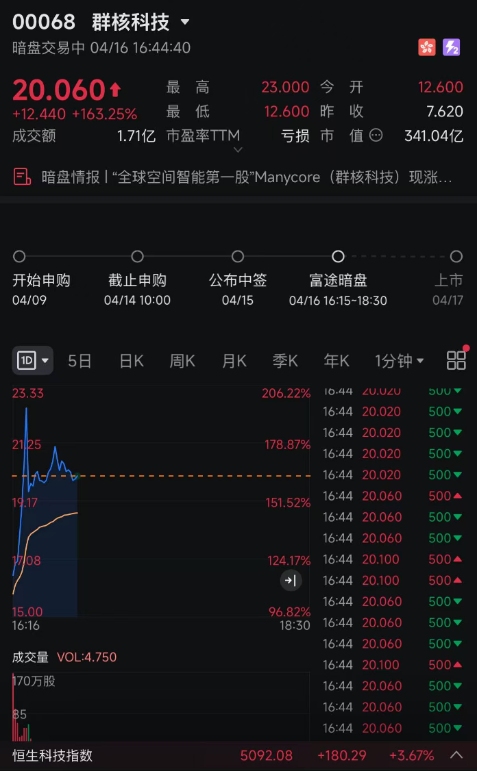 今日,群核科技(00068.HK)正式挂牌上市,报20.70港元,较发行价上涨171.65%。