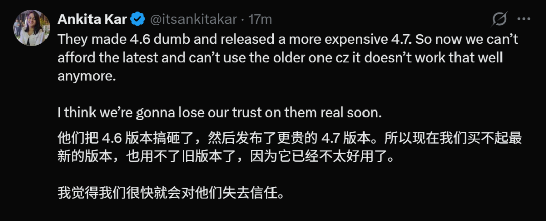 总之,这次Opus 4.7的争议,表面上看是一个产品更新的「翻车事件」,但它触及了一个更深层的问题。