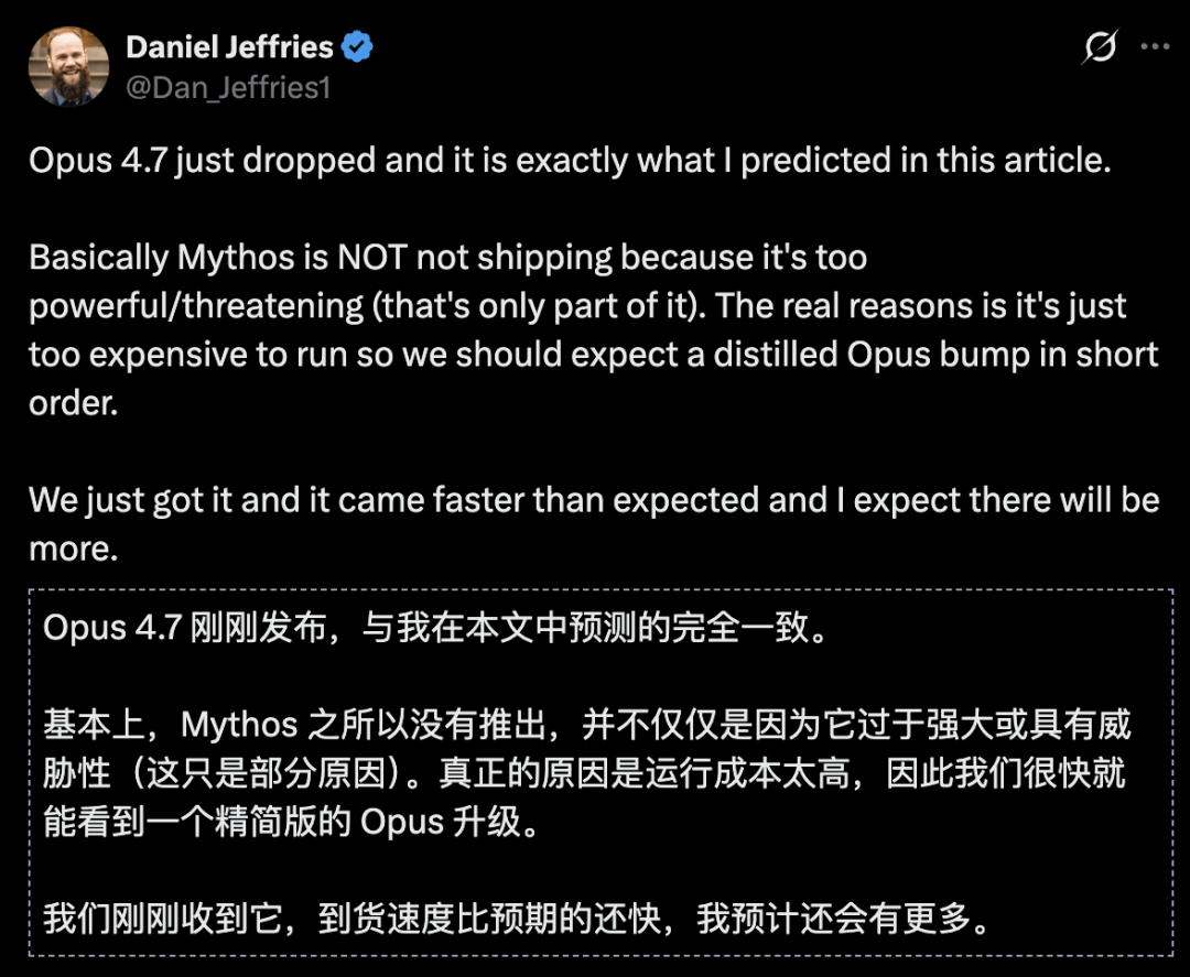 这不得不让人怀疑:Anthropic并不在意普通用户,要不然为什么发布一个比Mythos更差但比Opus 4.6更费token的Opus 4.7?