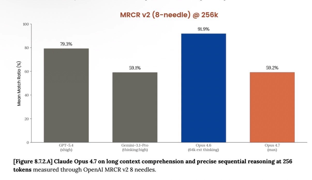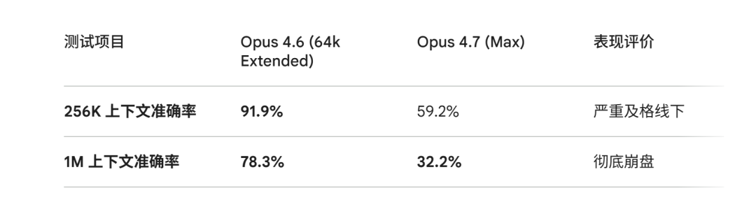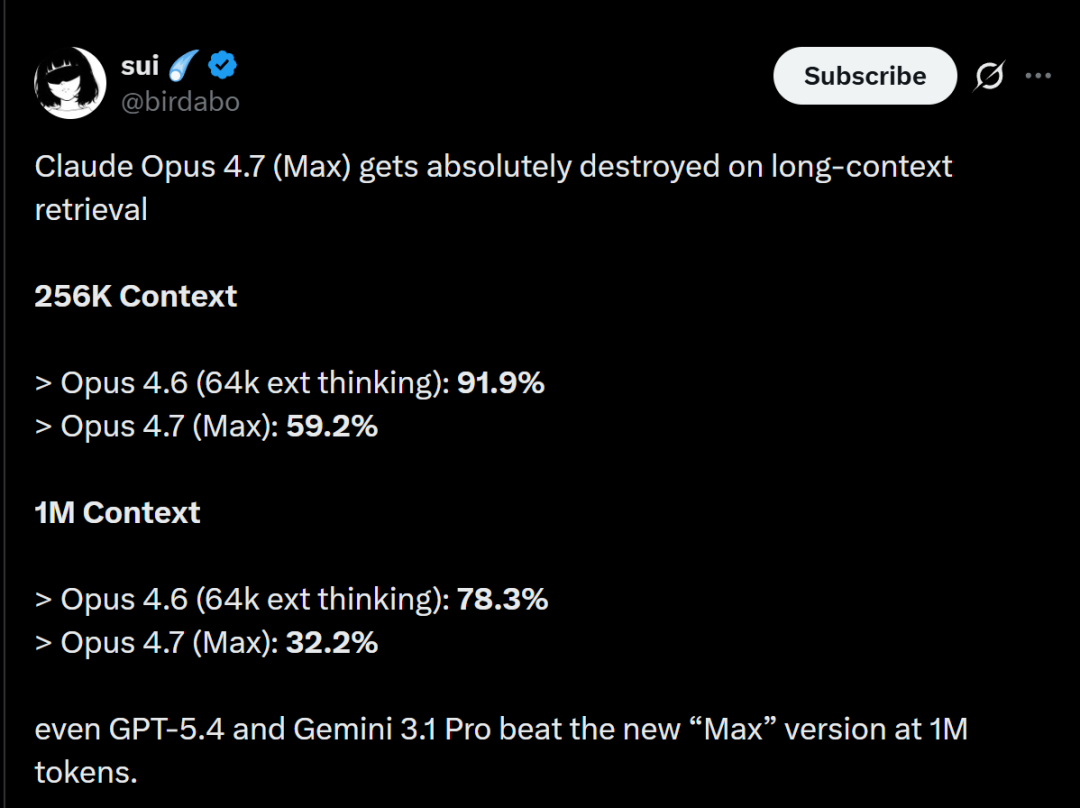 还有人发现,Opus 4.7(Max)在长上下文检索中完全被碾压,比起Opus 4.6来,性能倒退了不止一点。
