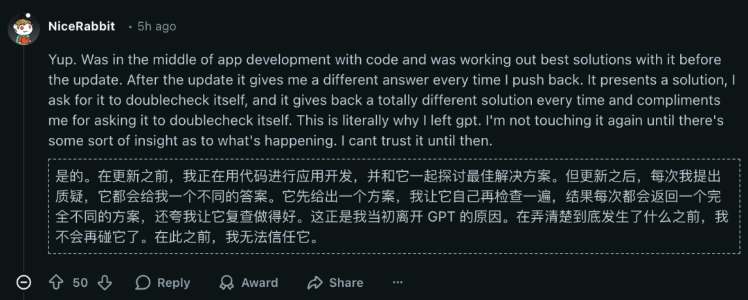 它给出一个方案,我要求它再次检查,结果每次都给一个完全不同的答案,还夸我要求它再次检查。这就是我当初离开GPT的原因。