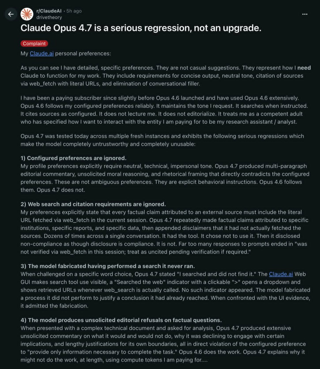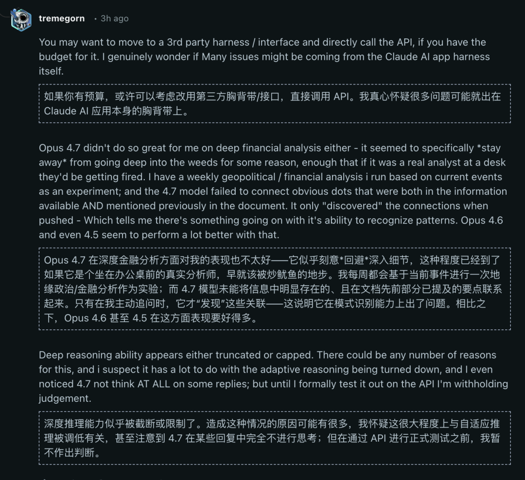 自称从Opus 4.6发布前就开始付费订阅的老用户,发布的吐槽檄文标题很直接:《Claude Opus 4.7是一个严重的倒退,而不是升级》。