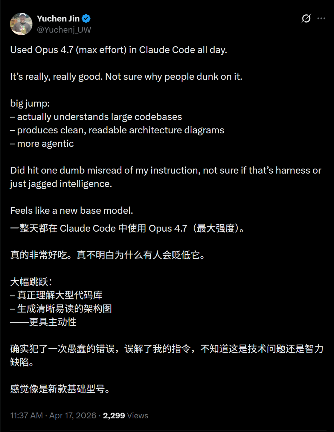 当然,在网上繁杂的声音中,也有人表示,Opus 4.7其实很好用,不明白为什么它会遭到贬低。