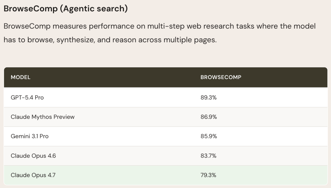 独立基准Vellum AI,发现在BrowseComp上,Claude Opus 4.7不进反退,退化4.4点,不敌GPT-5.4 Pro、Gemini 3.2 Pro。
