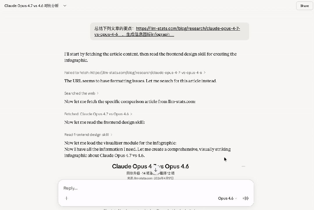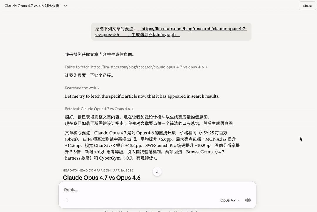 Opus 4.6总结用中文,但4.7用英文;但奇怪的是,AI思考过程使用的语言,正好反过来——