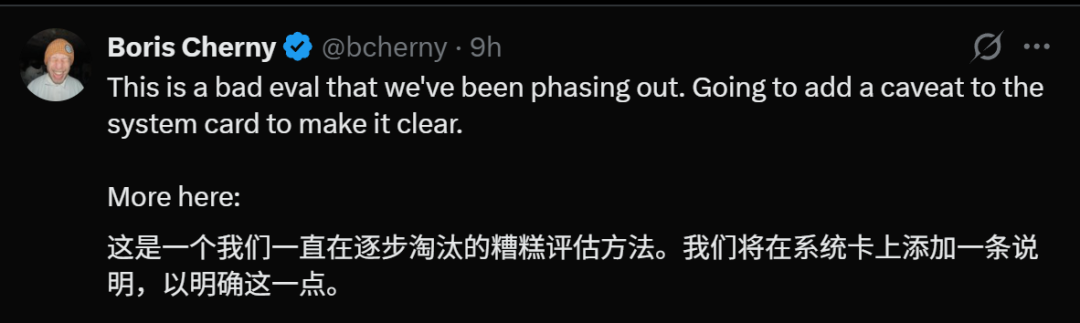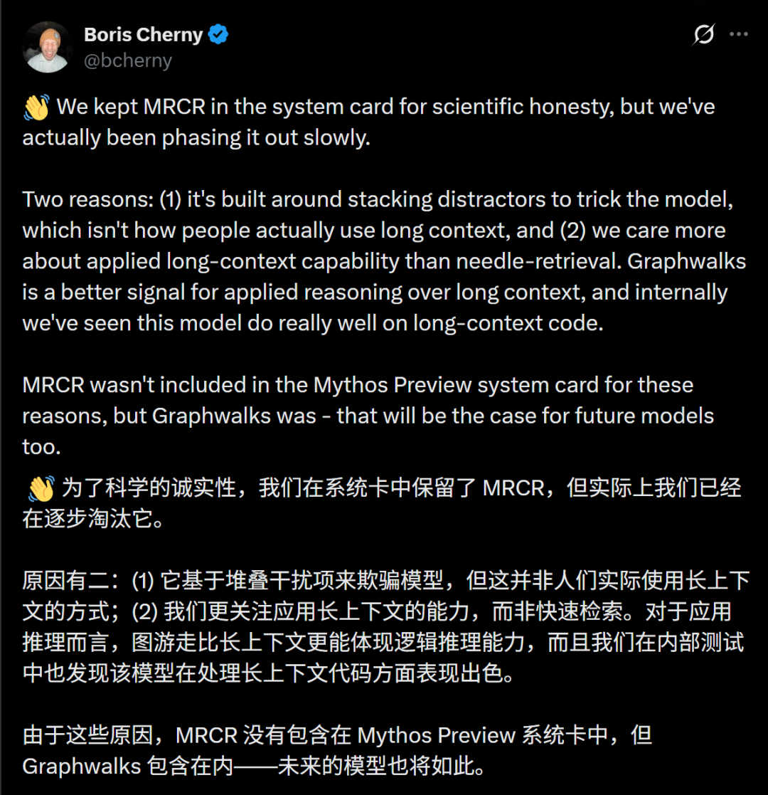 Claude Code之父Boris Cherny立马出现在评论区,他澄清说:MRCR是我们一直在淘汰的一个很糟糕的评估方法。