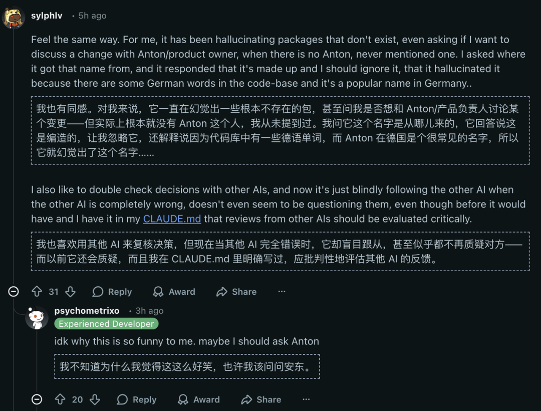 模型的回答堪称魔幻:「这是我编造的,请忽略。因为代码库里有一些德语单词,而Anton在德国是一个常见的名字……」