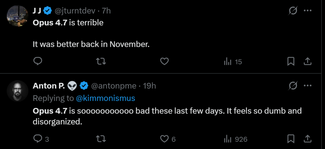 但无论如何,Opus 4.7的性能倒退,似乎是一个不争的事实。