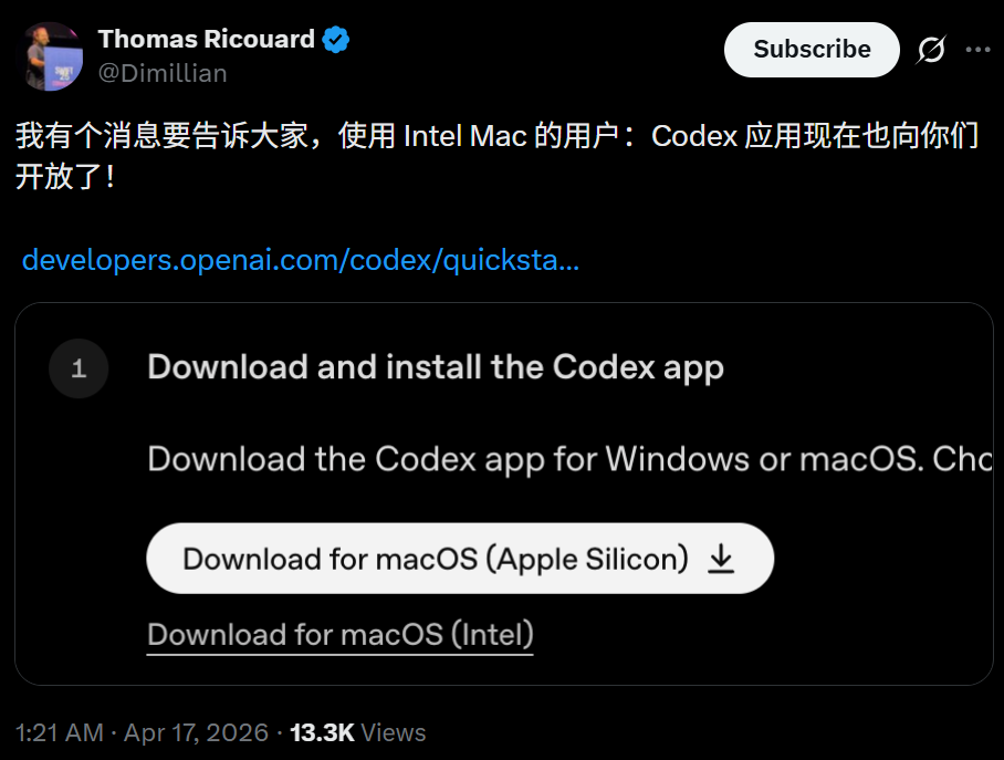 在这次更新中,Codex首次获得了对Intel Mac的支持